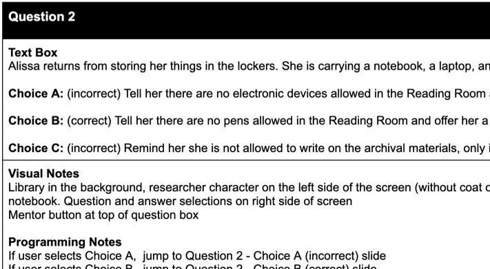 Design: I created a scenario-based eLearning experience where reading room assistants could practice enforcing library rules and procedures. I framed the scenario around an assistant’s first day in the reading room and her interactions with a visiting patron. Though there are many opportunities for accidents in an archives, I chose a scenario where the assistant must interact with and correct the behavior of a patron.